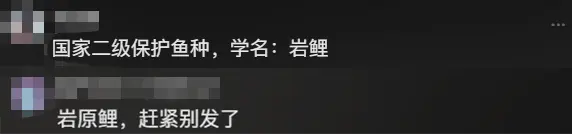 有网友则怀疑这鱼其实是国家二级保护动物岩原鲤。我好像经常在钓到奇怪鲤鱼的视频下面看到类似的评论,严重怀疑这些网友是同一批人,学到了新知识迫不及待的分享,但是却属于是生搬硬套了。