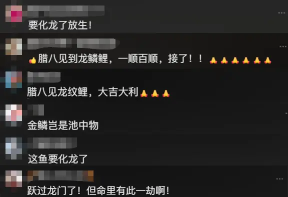 网友们的反应毫不意外,那天刚好是腊八,于是有几个网友直接开始接好运了,原理跟看到金色锦鲤差不多。其他人则是一直把这条鲤鱼往龙身上靠,他们表示这条鲤鱼已经要化龙了,是跃过龙门的级别了!可惜它命里有这么一劫,于是有网友建议博主将鱼给放生掉。