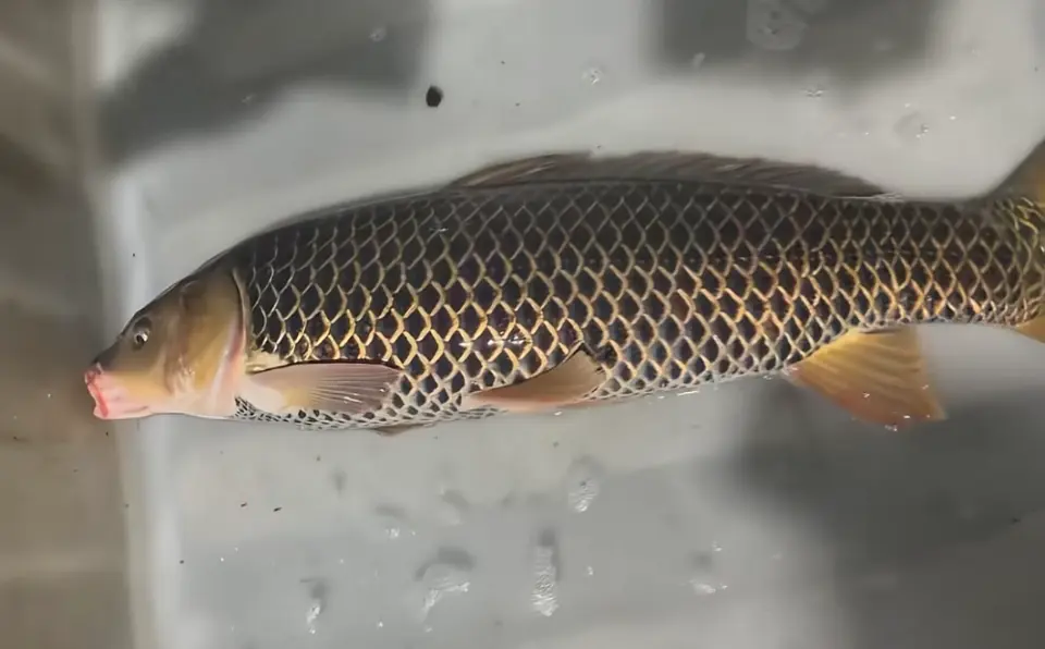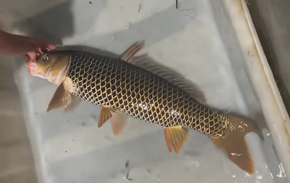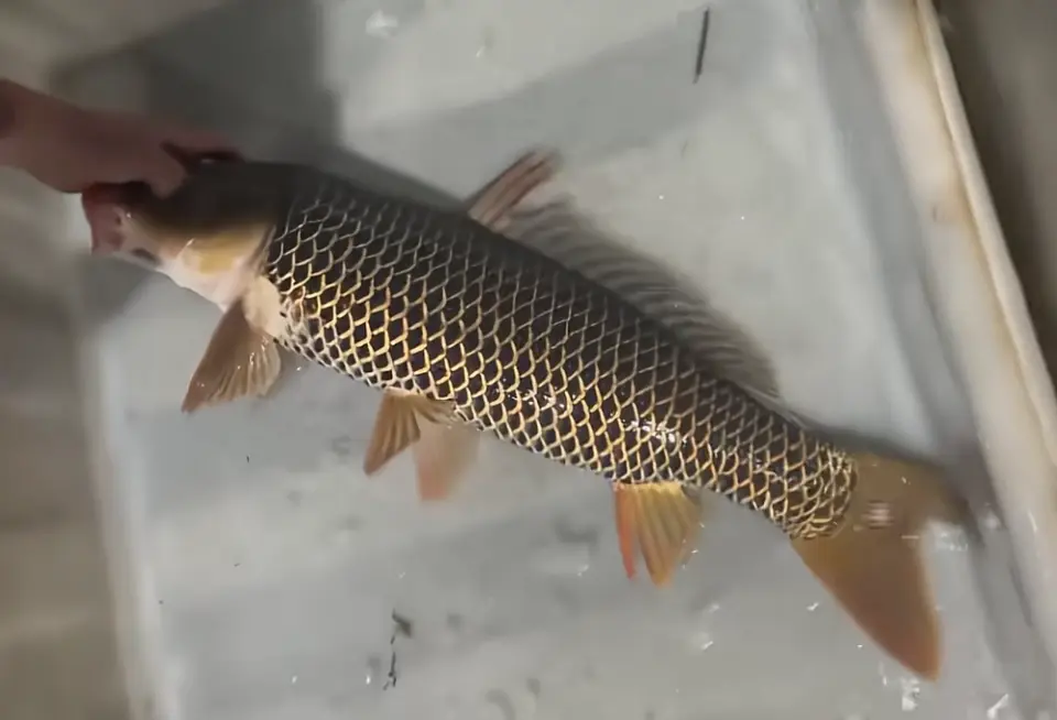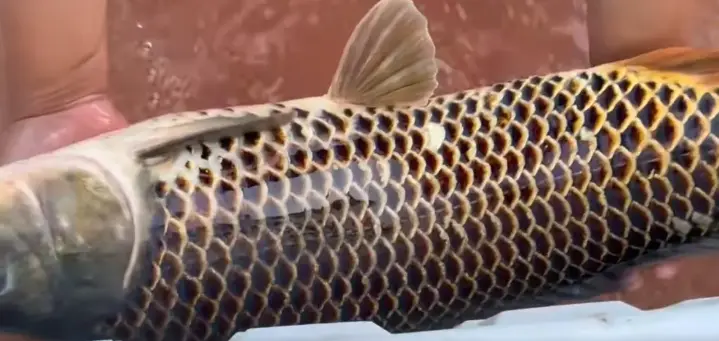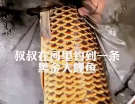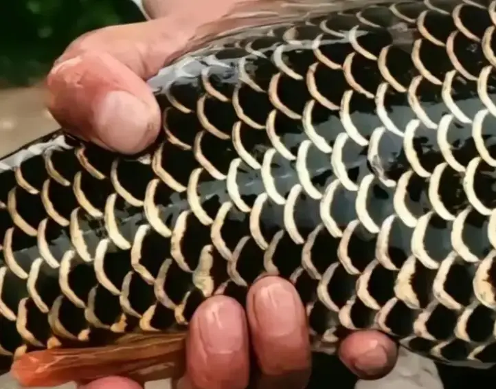 视频中可以看到这条鲤鱼的体型相当不小了,虽然估摸着没达到米级,但5~6斤肯定是有的。体型不是重点,重点是它这一身古怪的鱼鳞!它的鱼鳞非常规整,一片叠着一片,黑色鳞片的边缘明显是金色镶边的,非常之华丽!甚至连一般会呈现白色的腹部的鳞片也是这样的样式。